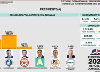 PRIMER BOLETIN: Abinader: 54%, Gonzalo 36% y Leonel 8.7%
